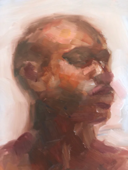 Self-portrait. Oil on panel, 12” x 16,” 2019. Available.